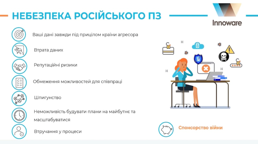 Використання софту з російським корінням сьогодні – це пряме спонсорування війни та величезний операційний ризик. «Переходячи з 1С на BAS, ми продовжуємо спонсорувати війну та наражати себе на небезпеку», – застерігає Олена. Серед критичних загроз вона виділила раптову втрату даних (вже зафіксовані випадки неможливості підключення до систем), шпигунство за персональними даними співробітників та репутаційні втрати.
